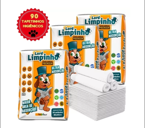 kit com 3 pacotes de Tapete Higiênico Lord Limpinho tamanho grande (80x60cm) PREMIUM com bloqueio anti vazamento e cada pacote vem com 30 unidades.